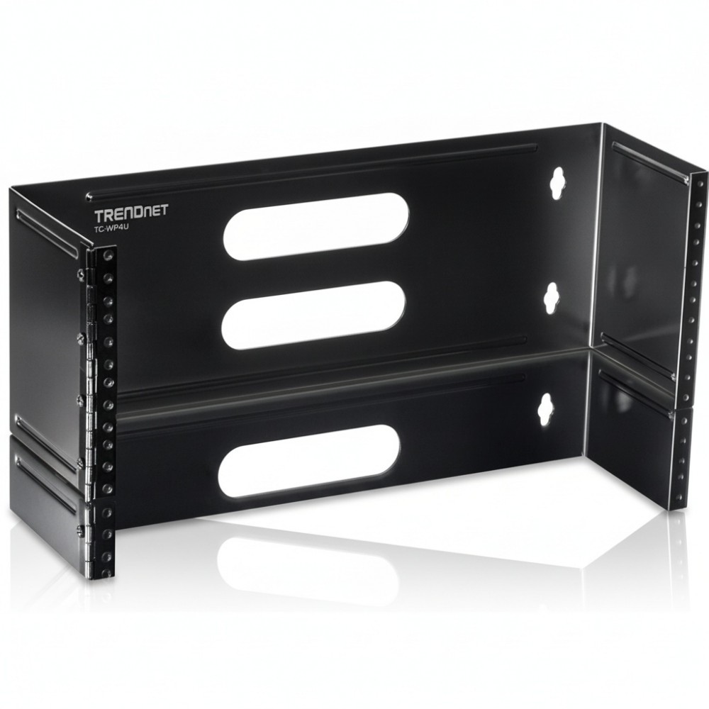 The TRENDnet TC-WP4U is a 4U 19-inch Hinged Wall Mount Bracket designed for organizing and securing rackmount equipment in environments where space is limited. It serves as a compact, space-saving solution for installing devices like patch panels and PDU power strips without the need for a full-sized equipment rack. This bracket is ideal for network closets, small offices, or any installation that requires a professional and organized setup in a constrained area. Constructed from sturdy, solid steel, this bracket ensures durability and reliable support for critical network hardware. Its key design element is a hinged frame, which provides convenient access to the rear of mounted equipment. This feature simplifies installation, maintenance, and cable management, allowing technicians to easily make adjustments without uninstalling the entire unit. The rear of the bracket also includes a cutout to facilitate clean cable routing. The TC-WP4U adheres to the EIA-310-D standard for 19-inch rackmount equipment, ensuring broad compatibility with a variety of networking hardware. Its shallow depth and vertical mounting orientation make it a versatile choice for wall-mounting equipment in tight spaces, providing a stable and accessible foundation for network infrastructure components.