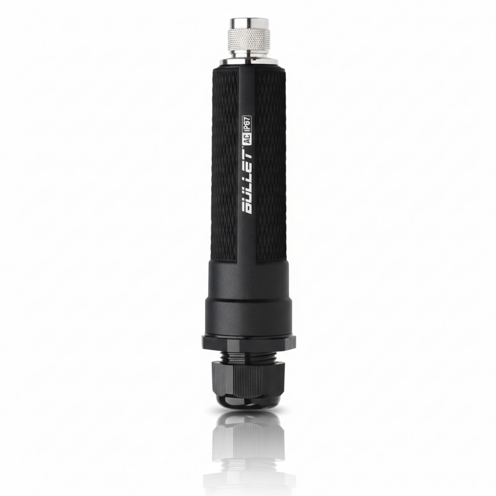 The Ubiquiti BULLETAC‑IP67‑US is a compact, outdoor airMAX AC dual‑band wireless radio used to build point‑to‑point or point‑to‑multi‑point links where rugged weatherproof performance is required. It covers both 2.4 GHz and 5 GHz bands and delivers real‑world throughput suited for long‑range links when paired with appropriate antennas. The unit includes a single Gigabit Ethernet port with passive PoE for data and power over one cable and an N‑type connector for external antenna integration. It fits deployments such as rural backhaul, campus bridging, or remote CPE connectivity in harsh outdoor environments.