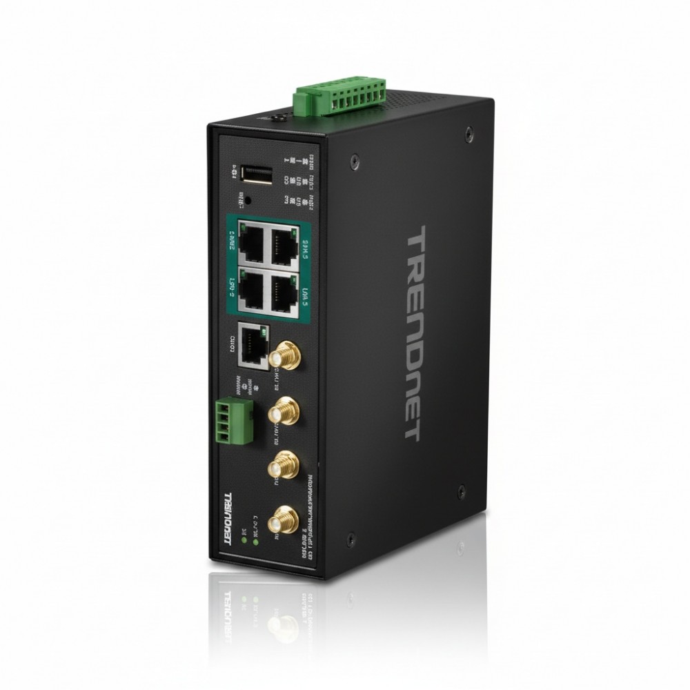 The TRENDnet TI-WP100 is an industrial-grade AC1200 dual-band wireless router designed to provide reliable, high-speed network connectivity in harsh environments. It is engineered for industrial applications that require robust wireless access and wired device support, solving the challenge of deploying stable networks in locations with extreme temperatures and conditions. The unit's hardened IP30-rated metal housing and wide operating temperature range ensure dependable performance in factories, warehouses, and outdoor enclosures. This router combines AC1200 Wi-Fi, featuring an 867Mbps Wireless AC network and a 300Mbps Wireless N network, with versatile WAN options for maximum uptime. It supports dual-WAN connections, allowing for load balancing across two internet sources or configuring one as a failover for redundancy. A key feature is its four-port Gigabit PoE+ interface, which supplies up to a 120W total power budget to directly energize devices like IP cameras, VoIP phones, and access points, simplifying installation and reducing infrastructure costs. Designed for DIN-rail mounting, the TI-WP100 integrates seamlessly into industrial control panels and equipment racks. Its fanless design enhances reliability by eliminating a common point of mechanical failure. Management is handled through a comprehensive web interface that provides advanced controls for traffic shaping, VLAN segmentation, and robust VPN security protocols like IPsec and SSL VPN, ensuring secure remote access and data protection for sensitive operational networks.